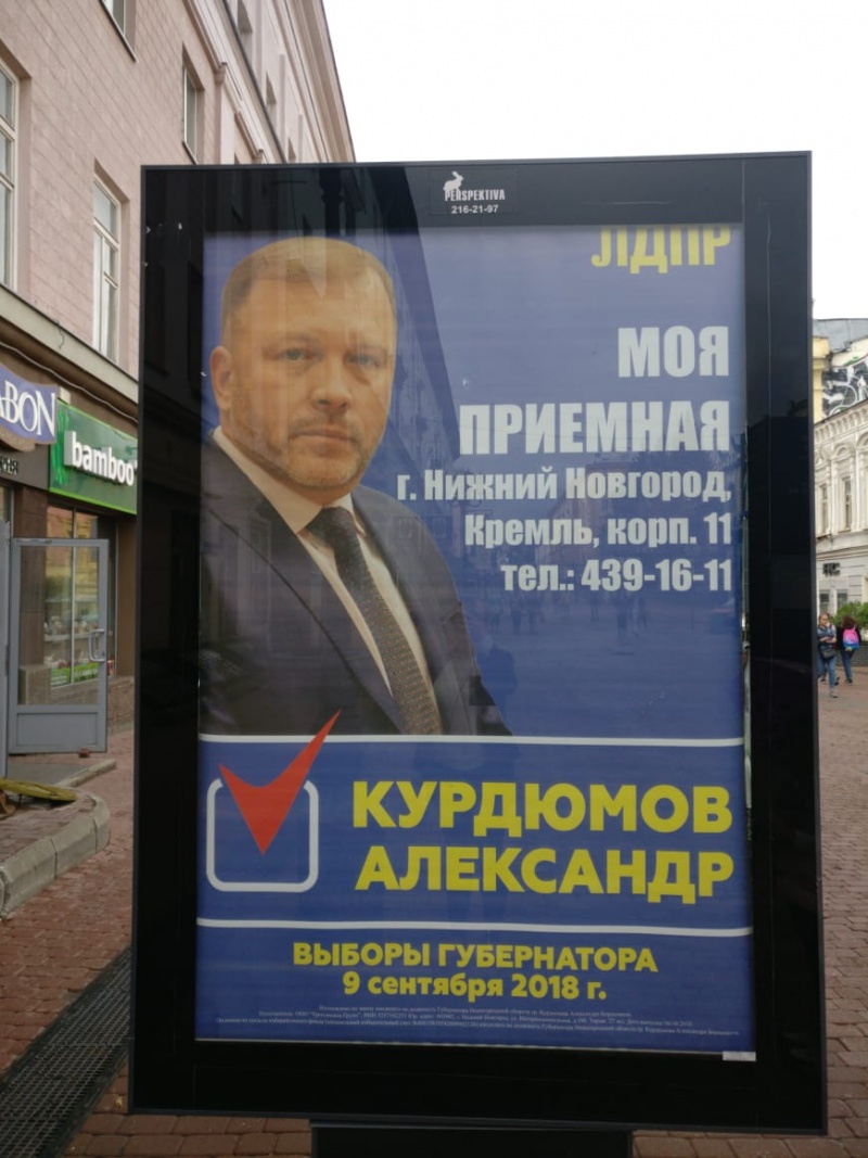 На общем фоне выделяются предвыборные плакаты кандидата от ЛДПР Александра Курдюмова – на синем фоне нет никаких лозунгов, только дата выборов и адрес приемной, которая, кстати, расположена в Нижегородском кремле.
