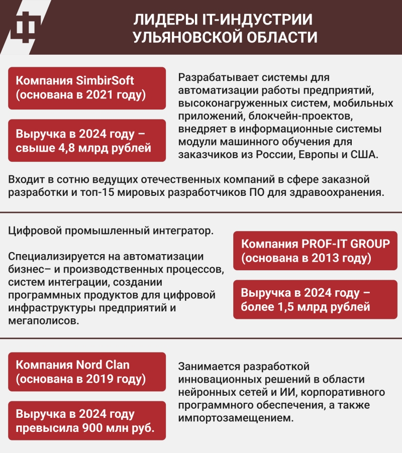 Так, в регионе наблюдается активный рост сферы информационных технологий. Сегодня она представлена 1584 компаниями, где трудится более семи тысяч специалистов. Стабильно растут налоговые отчисления в региональную казну от организаций отрасли: в прошлом году они достигли очередной рекордной планки в 2,16 млрд рублей. Особую роль играют три системообразующих ИТ-компании, которые выступают крупными поставщиками цифровых решений как для российского, так и международного рынков. Речь идет о PROF-IT GROUP, Nord Clan и SimbirSoft.