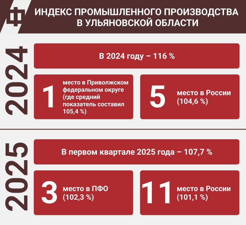 Напомню, по итогам 2024 года Ульяновская область стала лидером в ПФО по индексу промпроизводства и вошла в пятерку лучших по стране. Показатель составил 116 %, что выше среднероссийского на 11,4 %. Наибольшую динамику продемонстрировала обрабатывающая промышленность, в том числе сферы авиа- и автомобилестроения. С начала 2025 года положительная динамика сохраняется: опережаем среднероссийские темпы. Флагманом гражданского сектора традиционно является автомобилестроение и автокомпоненты: только за прошлый год объем отгрузки здесь превысил 116 млрд рублей, увеличившись на 4 млрд.