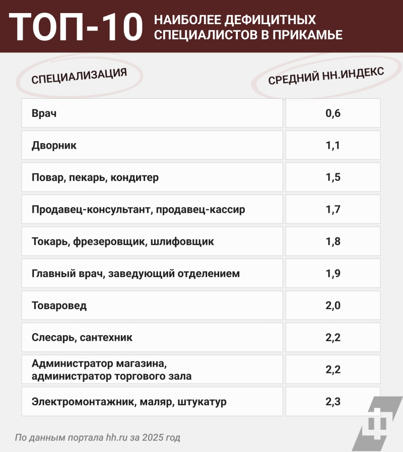 Наиболее же дефицитными в 2025 году стали врачи: на одну активную вакансию приходилось всего 0,6 резюме (при норме 4,0–7,9). «Также острый дефицит наблюдался среди дворников (1,1 резюме), поваров, пекарей и кондитеров (1,5), продавцов-консультантов и кассиров (1,7), токарей, фрезеровщиков и шлифовщиков (1,8), главврачей и заведующих отделением в медучреждениях (1,9)», – отметила Ирина Егорова.