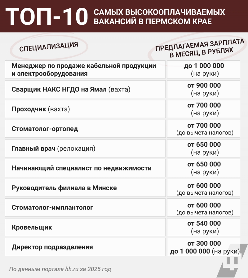 По данным платформы онлайн-рекрутинга, в Пермском крае топ-10 специалистов с самой высокой медианной зарплатой в вакансиях в прошлом году возглавили коммерческие директора – 250 тысяч рублей.