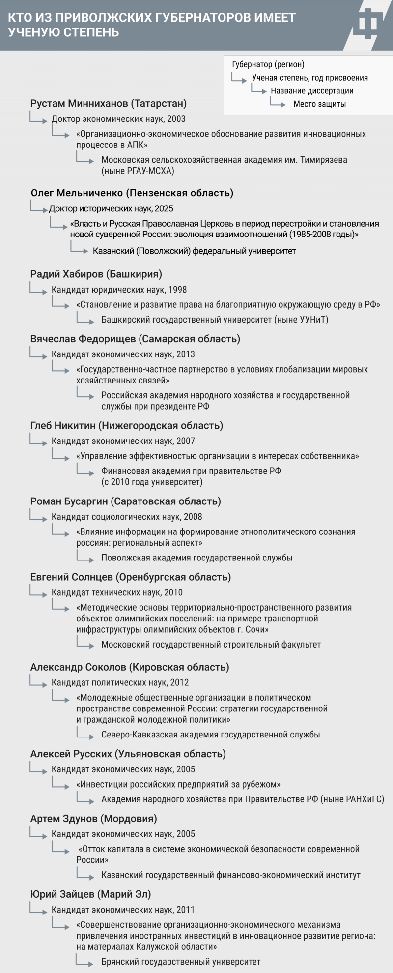 Обладателями высшей ученой степени являются главы Татарстана и Пензенской области. В 2001 году Рустам Минниханов в Московской сельскохозяйственной академии имени К. А. Тимирязева (сейчас РГАУ-МСХА) защитил докторскую диссертацию по экономике. Ее тема – «Организационно-экономическое обоснование развития инновационных процессов в АПК».