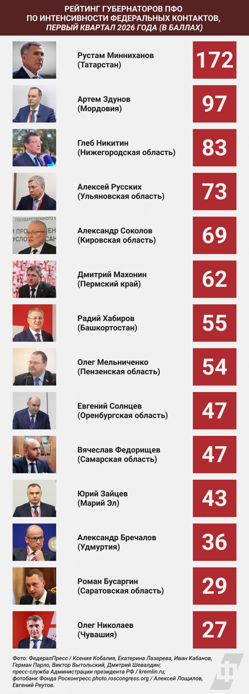 С большим отрывом рейтинг возглавляет раис Татарстана. По итогам первого квартала Рустам Минниханов набрал 172 балла. На втором месте находится еще один уроженец Татарстана – Артем Здунов, у которого в этом году истекает первый срок полномочий на посту главы Мордовии. В его активе за первые три месяца 2026 года 97 баллов.