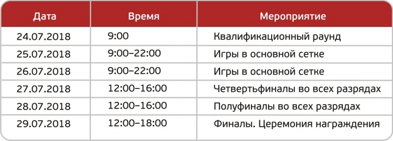 Запланированы игры в мужской и женской одиночке и парах, а также смешанном разряде.