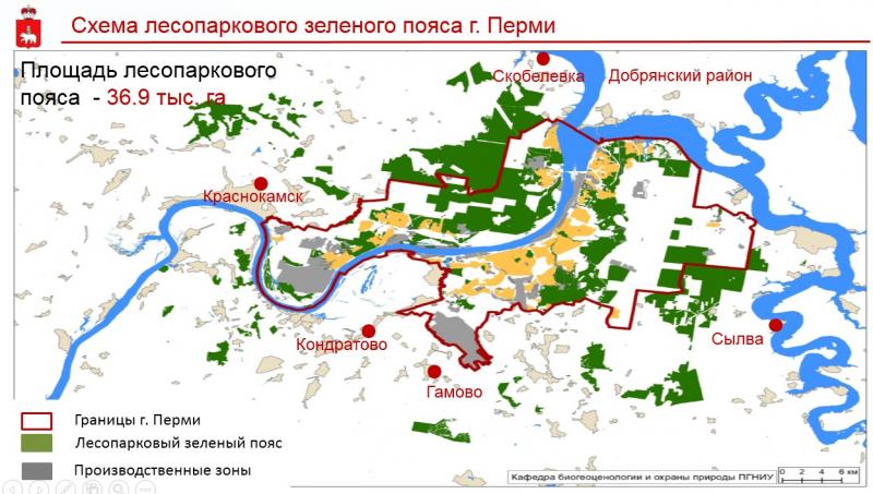 В лесопарковый зеленый пояс Перми вошли наиболее ценные с точки зрения охраны природы объекты: Черняевский лес, Закамский бор, Мотовилихинский пруд, зеленые насаждения в долинах малых рек Гайвы, Ласьвы, Мулянки, Ивы, Язовой и другие. Площадь территории лесопаркового пояса почти 37 тысяч гектаров – это один из самых крупных зеленых поясов в городах-миллионниках. Полномочиями по установлению на местности границ «зеленого щита» было наделено Минприроды Прикамья.