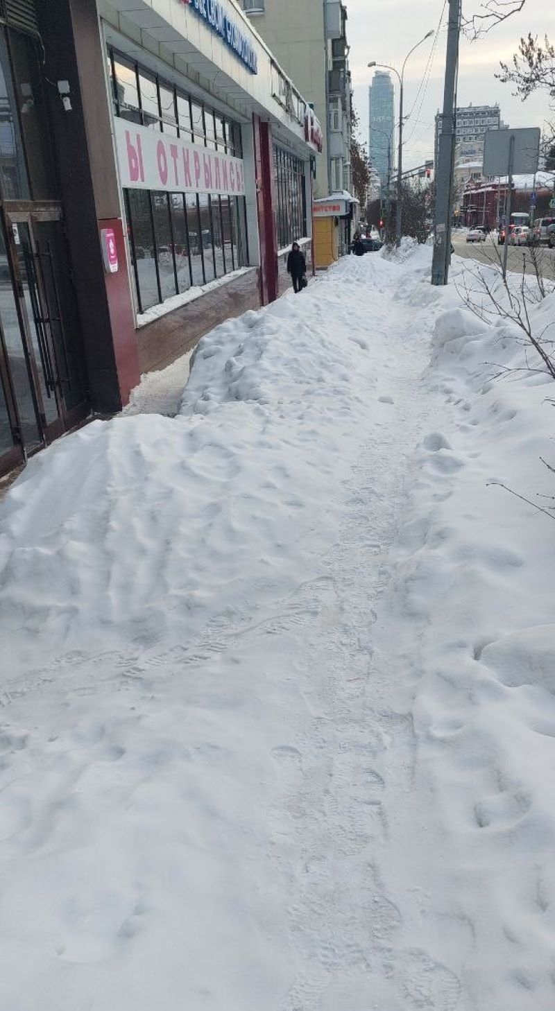 «Куча снега высотой по пояс взрослого человека лежит посреди тротуара с 25 февраля. Пешеходы протоптали узенькую тропку вдоль стены здания, а чуть позже – другую, прямо поверх снежного гребня», – рассказал екатеринбуржец Дмитрий.