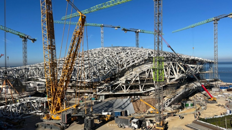 В качестве фундаментов здания запроектированы монолитные железобетонные плиты на естественном основании толщиной 500, 1000 и 1600 мм из бетона класса В30. Основные несущие конструкции выполнены в виде железобетонного каркаса и закрепленных к нему стальных пространственных конструкций. В решениях фасадов применено многослойное стекло, сочетающее солнцезащитные и энергосберегающие функции. Необычная волнообразная крыша, представляющая собой единый архитектурный элемент длиной более 100 метров, запроектирована с учетом 30 подвижных опор, каждая из которых выдерживает вес, превышающий тысячу тонн.