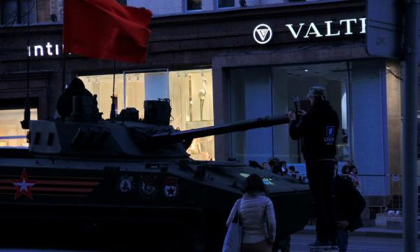 Как передает корреспондент «ФедералПресс», в среду в составе колонны во второй раз за неделю по центру города прошла новейшая российская военная техника, за исключением двух танков Т-34-85 и бронетранспортеров БТР-80. Кроме них, москвичи и гости столицы, пришедшие на улицу Тверскую, могли воочию увидеть основные боевые танки Т-14, Т-72Б3, бронетехнику на современных боевых платформах «Армата» и «Курганец-25», самоходные артиллерийские установки «Коалиция-СВ» и «Мста-С», прошли бронеавтомобили «Тигр» и «Тайфун», в том числе вооруженные противотанковыми ракетными комплексами «Корнет». Также можно было увидеть бронетранспортеры БТР-82А, БТР-МДМ, «Бумеранг» и боевую машину десанта БМД-4.