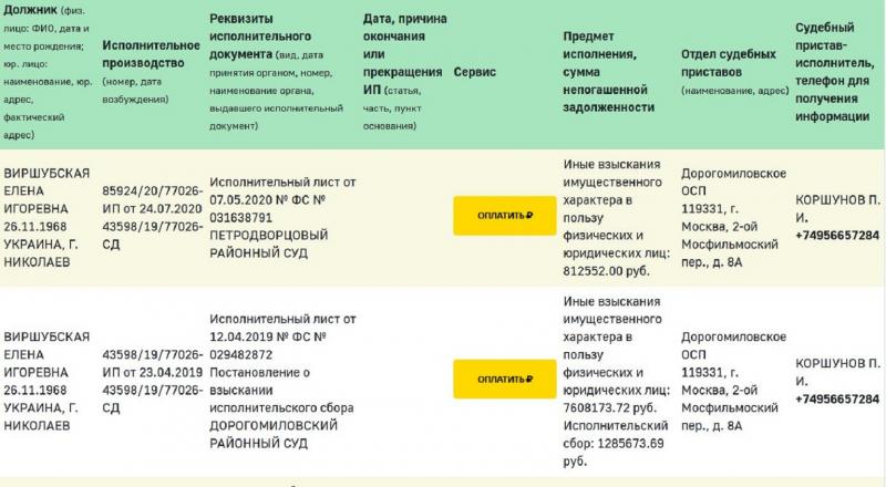 На сайте судебных приставов Москвы есть информация о том, что за женой певца Еленой Виршубской числится достаточно много долгов: общая сумма задолженности превышает 9 миллионов рублей. Кроме того, есть у нее и долги по коммуналке.