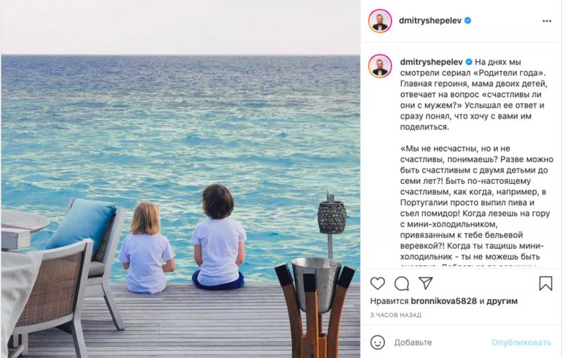 Телеведущий Дмитрий Шепелев решил порассуждать на тему отцовства. На этот вопрос его навел монолог из сериала «Родители года». Там героиня рассказала о том, что никогда не сможет быть полностью счастлива с детьми. По ее мнению, дети до 7 лет значительно усложняют жизнь родителям.