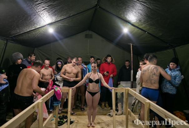 Как передает корреспондент «ФедералПресс», находящийся в эту ночь со всеми прихожанами около храма, на площадке установлено несколько палаток, в которых расположится купель с деревянными перилами и сходнями. Пункт обогрева работает без перебоев – можно переодеться и выпить горячего чая.